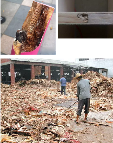 據(jù)業(yè)內(nèi)人士透露,“黑心板材”是黑心廠家為了節(jié)約成本,從木材廠收來廢舊木料,有些甚至是腐爛的、被焚燒過的碎木,經(jīng)過工人們拋光翻新之后,灌注膠水,通過冷壓制成的。